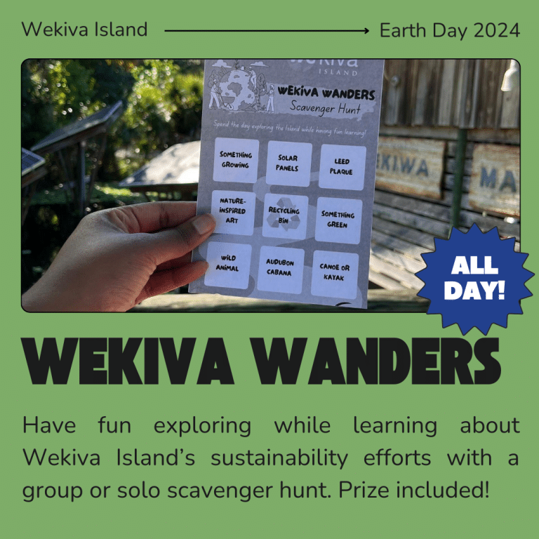 Have fun exploring while learning about Wekiva Island’s sustainability efforts with a group or solo scavenger hunt. The card can be picked up on April 19 at the Tooting Otter or found on Wekiva Island’s Instagram Stories to complete and reshare.